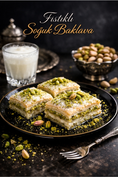 Soğuk baklava, klasik baklava yufkasının arasına genellikle bol antep fıstığı veya ceviz konularak hazırlanan, ancak final aşamasında şekerli su şerbeti yerine sütlü bir şerbet ile ıslatılan tatlıdır. Üzerine serpilen kakao ve rendelenmiş çikolata ise ona hem görsel bir şıklık katar hem de sütlü nuriye ile trileçe arasında bir lezzet dengesi kurmasını sağlar.